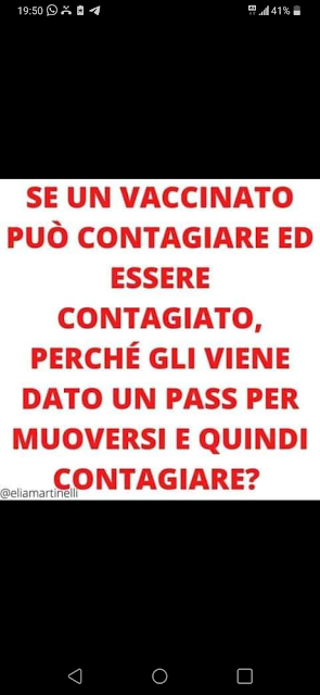14)-Sono perfettamente d'accordo sul fatto che si tratta solo o quasi esclusivamente di terapie geniche e al solo scopo di farci ammalare e morire in modi diversi, in tempi diversi e possibilmente senza lasciare le prove a livello ufficiale di questo crimine contro l'umanità, quindi non possiamo nemmeno parlare di vaccini sperimentali non adeguatamente testati. Mentre, i grandi affari per Big Pharma, per i virologi e politici e giornalist venduti, per gli ospedali, per la vendita di tamponi e mascherine, per Bill Gates come finanziatore e affarista, ecc. ecc, sono solo il carburante per fare andare avanti il percorso politico covid-19 con il solo scopo di far controllare e di far ridurre la popolazione fin oltre l'80% possibilmente entro il 2025 o al massimo entroDrag2030. Naturalmente questo è l'intenzione dei poteri forti e dei governi fantoccio come quelli di Mario Draghi. Sono così geniali e così certosini nel fare il male come servitori di Satana che per mettere la ciliegina sulla torta a questa propaganda del pensiero unico, per farci credere che c'è un monitoraggio sui vaccini, hanno perfino parlato male di AstraZeneca e lo hanno pure momentaneamente bloccato, ma, solo per buttarci fumo negli occhi e per convincerci tutti a vaccinarci in continuo terrorismo mediatico senza posa, per giunta, con il ricatto illegale sul lavoro e da agosto pure attraverso il green pass vaccinale obbligatorio per poter andare in sempre più luoghi che domani potrebbero coinvolgere anche quelli per comprare le cose di prima necessità. (Beh, sotto questo aspetto fanno bene quelli di Forza Nuova nel respingere chi ha il green pass, si tratta di schiavi e di caproni che danno man forte alla dittatura sanitaria fino al giorno che moriranno per vaccino covid-19. Ovviamente, io non parteggio per Forza Nuova e per me pressoché tutti i partiti italiani sono tutt'uno. Ciò che forse ci potrà temporaneamente salvare è la nostra consapevolezza di cosa sia veramente il percorso Covid-19 ed evitare senza compromessi tutte le trappole in esso: vaccini, green pass, tamponi, ecc. Inoltre, mi par giusto boicottare bar e ristoranti che per sedersi all'interno chiedono il green pass e per giunta anche se sul momento fosse più ok il sedersi all'aperto. In quanto all'essere fascisti, anche il PD i 5S e non solo, si sono dimostrati fascisti sia durante la dittatura in prevalenza finanziaria e sia durante la dittatura in prevalenza sanitaria. Morale finale del discorso: tanti partiti per lo più uniti da dietro alle quinte, dividi, impera, confondi, schiavizza e distruggi il popolo quando ritenuto di troppo.)
