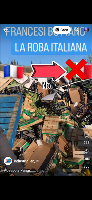 I francesi, invece di essere uniti con gli italiani per opporsi al Nuovo Ordine Mondiale voluto dalle élite, respingono i prodotti italiani. E così, i poteri nazi-satanici hanno successo nel metterci uno contro l'altro sia all'interno di una nazione sia tra nazione e nazione e perfino anche tra coloro che vanno nelle piazze e nelle strade per protestare contro le ingiustizie da parte del sistema capitalista comandato dalle élite. I contadini dai paesi europei come Francia, Germania e Italia dovrebbero esser tutti uniti, non tanto contro le importazioni di prodotti di qualità e già stimati da parte dei popoli in altri paesi, ma, dovrebbero essere uniti soprattutto contro le importazioni inutili e di prodotti geneticamente modificati e/o di bassa qualità da altri continenti e ancor più contro la imposizione graduale dell'UE affinché smettiamo del tutto di mangiare carne, pesce, latte e suoi derivati, olio d'oliva, buon vino, ecc. e cominciamo sempre più a nutrirci con insetti eventualmente pure geneticamente modificati ed eventualmente con altri prodotti industriali al quanto discutibili e dietro i quali può esserci lo zampino di fenomeni come Bill Gates. Disuniti ci si fa la guerra e ci si danneggia l'un l'altro ma se si fosse stati più uniti e di più si avrebbe avuto molta più forza sia come cittadini sia come contadini e non solo.